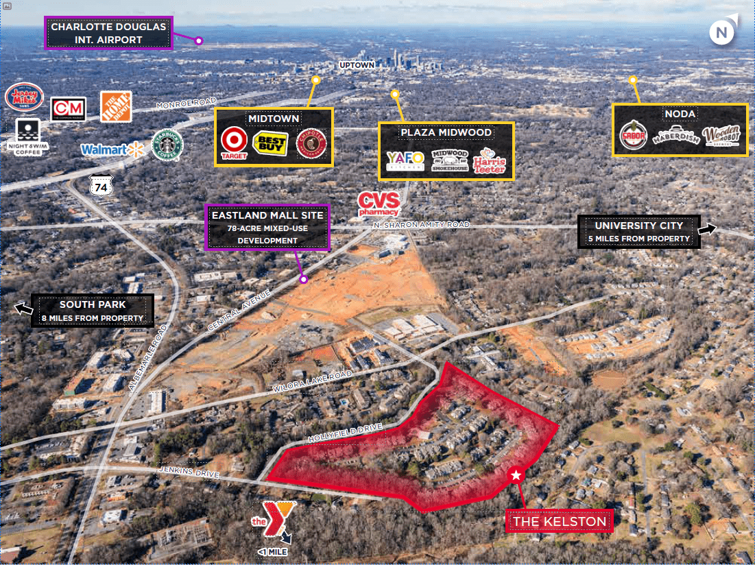 - The Kelston Apartments, a 310-unit multifamily community, adjacent to the Eastland Yard redevelopment, in East Charlotte, offers a favorable basis amid seller distress and pending loan maturity.