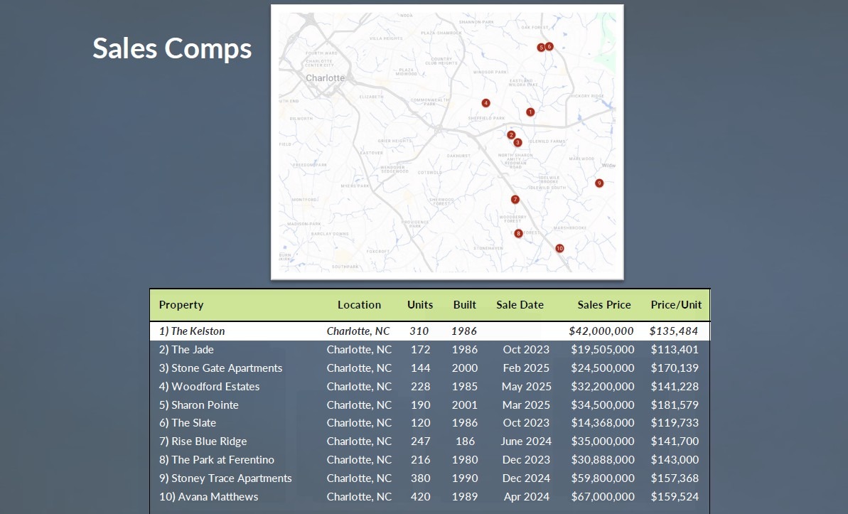 - The Kelston Apartments, a 310-unit multifamily community, adjacent to the Eastland Yard redevelopment, in East Charlotte, offers a favorable basis amid seller distress and pending loan maturity.